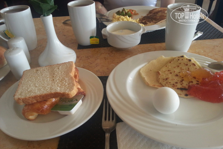 Завтрак. На террасе готовили глазунью и омлет с овощами. В ресторане готовили блинчики и пончики. Были круассаны, вареные яйца, овощи на гриле)))) Каждый день были апельсины, мандарины, дыни и бананы. Разные йогурты. Много видов повидла. И большое разнообразие булочек)))) Фруктовые салаты))) И куча всего)))))))))