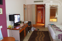 По приезду нас встретили вкусными коктейлями, усадили на диваны,собрали паспорта и отправили на обед. После обеда заселили в номер. Номер у нас был супериор, получилось с видом на бассейн и соответственно на море.Думали будет шумно, но как ни странно, не было ничего слышно если закрыть балконную дверь. Шумоизоляция в отеле очень хорошая, ни разу не слышали соседей или кого-то в коридоре.В номере,сейф, тв, гладильная доска, утюг, чайник,чай кофе, бутылка воды 1,5л., 2 стола, диванчик, большая кровать, на балконе кресло,лежак и столик.Ограждение балкона, сделано и полупрозрачного пластика, таким образом снаружи не видно что за перегородкой, а внутри как размытое стекло. (это для тех кто жалуется что окна на балконе грязные.Люди!!! это пластик!). Единственный минус, это душевая перегородка, нужно класть полотенце и подпирать дверью, иначе все будет в воде. И кондиционер, то работал то нет, центральный.