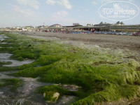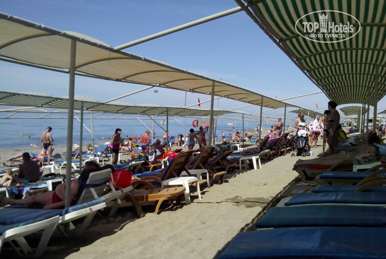 5. Пляж. Галька. Песок только в зоне лежаков. Вероятно когда то давно засыпали пляж песком, но его уже весь вымыло на берег. Прямо по середине пляжа камни с водорослями, с них в воду не зайти. Там где заход более менее сносный – через 10 метров в воде опять эти же острые камни. Лежаки ушатаные, половина с прикрученными фанерными листами с синей краской, под которой спрятаны дыры.