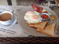 ЗАВТРАК-скудный! Яичница, три полоски бекона, масло слив, два тоста, два кусочка огурца, один помидорки. Кофе, чай неограниченно. Фруктов нет