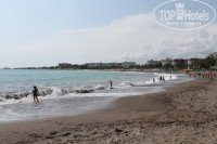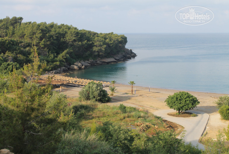 За пляж отельная твердая 5! Расположен в бухте, вода чистая, песок+мелкая галька. Вход в море хороший, пологий. Один день застали непогоду, был сильный дождь, на море принесло много травы и мелкого мусора, однако уже на следующий день вода была чистая, красивого бирюзового цвета. Тем, кто бывал в Мармарисе, придется по душе холмистость бухты с обилием хвойной растительности - небольшой хвойный оазис, тропинка оттуда выводит на скалистый берег,откуда открывается панорамный вид на Аланию (слева) и ряд отелей бухты (справа). Пляж чистый, с вечера убирается сотрудниками, дорожки моют,за чистотой следят.