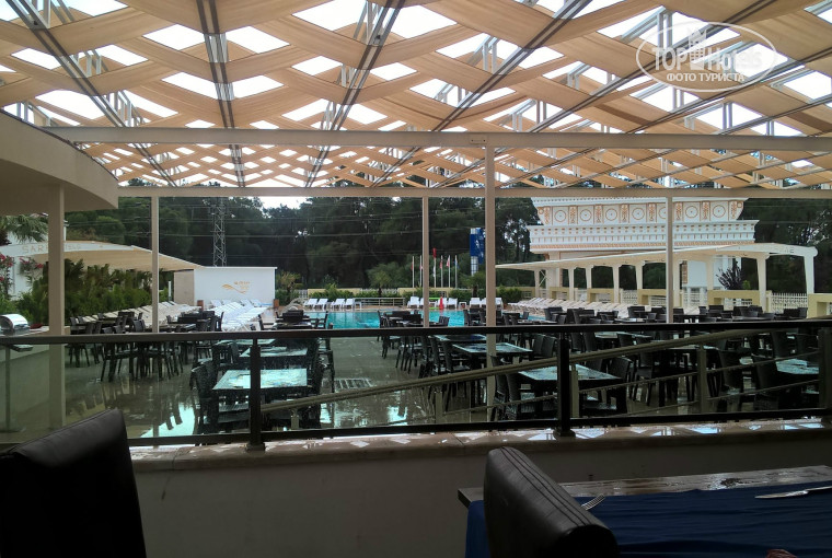 Сделан на скорую руку, много строительных косяков (вроде замазанных шпаклевкой светильников на потолке и адских стенок на балконах, а также разваливающихся стыков обоев на потолке номеров), адски медленные, если не сказать "тупые" лифты. Они работают настолько неспешно, что их бы штук пять на отель и было бы хорошо. А так, вызвал, ждешь пару минут, плюнул, пошел пешком (неважно вверх или вниз), а лифт от этого впадает в полное безумие, т.к. таких людей полно. В итоге те, кто таки дожидаются, они все же дожидаются, но уже слегка закипая. Местами отключается декоративная подсветка этажей. Главный вход зачем-то разграничен для пандуса и остальных. Для пандуса предназначена отдельная дверь, конечно же, закрытая по умолчанию. Логику не понимаю. Что мешало пандус завести на главный вход и всё, а не городить ограду и лишнюю дверь прямо встык с главным входом. По-моему, чушь. Топографическая концепция отеля такова, что она искусственно создаёт две зоны, проход между которыми отель искусственно затрудняет. Чисто психологически. Чтобы тебе пройти, к примеру, от главного бассейна к бассейну с горками, надо пройти через бар, потом через пандус (или как вариант - лобби), затем через внутреннюю улицу (где ездят автомобили), а уж там заветный бассейн. Бред. В итоге, счастливые обладатели фемили-румов дружно тусят в маленьком бассейне, все остальные - в большом. А горки вообще свободны - ура. Дискотека полный отстой, комментариев нет. Крохотное помещение и полтора человека. Теннисный корт (да, я идиот) в первый день, как мы приехали (и сразу пошли играть), был с лужами, я не обратил внимание. а надо было отдать всё назад сразу. Нереально бегать по корту, на котором лужи. Ну бог с ними, с 5 долларами. В последующем наблюдал картину, когда на обеих сторонах корта играют в баскетбол, т.к. там висят корзины и мячи, видимо, тоже дают в аренду, и иногда по 6-9 человек, и парочка несчастных, кхм, теннисистов, пытаются там среди них бегать. В общем и целом - профанация. Хотя, детям весело. Однако травмоопасно для всех сторон. Стационарный гриль был бы в тему в самом конце бассейна, где душ. Там бы и дым не летел на ресторан, и толпы бы лишней не было. Комары такие же дикие, как турецкие воробьи - мелкие и очень шустрые, но жрут как лошади. Запасайтесь репеллентами. До полуночи на стороне Vera Verde шумно из-за их анимации. Музицируют, орут, бахают бумкают и тому подобное, а местные лягушки вторят в ответ. Закрытая дверь не очень помогает. Если сон чуткий, либо привыкайте засыпать после 12, либо просите номер с другой стороны (не уверен, что спасёт)