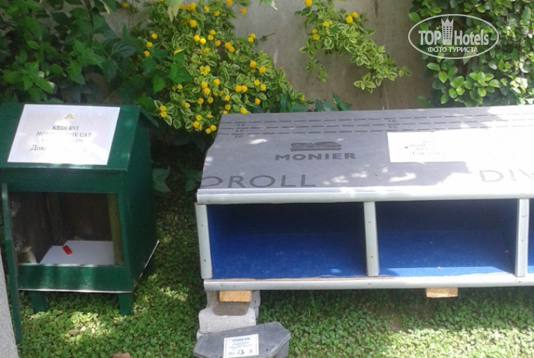 Напишу сначала, что изменилось: на ресепшен приняли новых менеджеров, девочки (страны СНГ) говорят по-русски, недавно кто-то вопрос задавал. Вместо Керима барами и официантами руководит Умит, очень строгий и серьезный начальник, официанты работают как всегда на 5. Есть новые, не очень понимают по-русски, но рядом с ним всегда "наставник" из опытных ребят. Борьба за улучшение экологии: разноцветные мусорные ящики, предложение в номере (табличка) не менять белье (нам меняли ежедневно), если считаем, что оно пока чистое. Еще теперь в отеле любят кошек (на фото домик для кошек, надпись не получилась) и птичек (на пальмы прибили скворечники). Бич-бой тоже новенький, парень у себя на уме, но старается. улыбается. Команда аниматров новая, пока расскачивается, ничего особенного сказать не могу. Все остальное осталось по-прежнему:спокойный семейный отель с приличными номерами и хорошим питанием. Надеюсь в сентябре снова там всех увидеть.