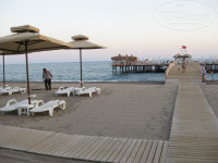 ПЛЯЖ: Песочный с мелкой галькой на входе в море. Галька не сильно напрягала, т.к. она очень крупная и глубина быстро начиналась. Есть разделение пляжа на две части курящие и некурящие, однако курили очень мало, поэтому мы и в курящей части не испытывали дискомфорта. В некурящей части расположена большая крытая песочница с домиками, качелями и горками - дочка очень любила там копаться после купания. Чтобы не ходить по горячему песку, к лежакам сделаны деревянные настилы. Пирс просто шикарный, пожалуй, лучший из тех, что видел. Каждый вечер по пляжу ходил парень с большой трубой за собой (см. фото) и причесывал песок - очень красиво получалось (см. фото контраста). Так же видел, как вечером ходили техники и смотрели за состоянием пляжных зонтов и даже немножко покосившиеся выравнивали/натягивали, чтобы они все красиво в ряд стояли. Самое неприятное то, что одни туристы с утра занимали лежаки полотенцами и уходили по своим делам - это неуважение к другим дико раздражало.