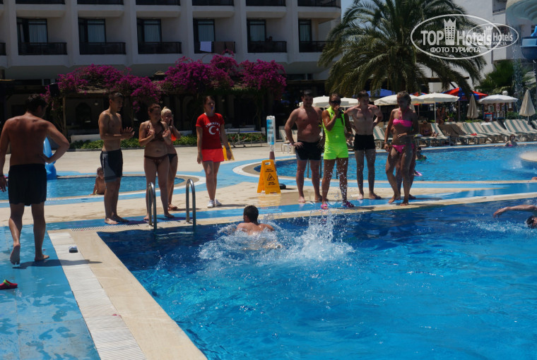 И конечно же- РЕБЯТА-АНИМАТОРЫ! Обаятельны и превлекательны! Не дадут заскучать. Поднимают с лежака своими обаятельными улыбками и заставляют активничать в наше же удовольствие! Эстафеты, дартс, водные игры и многое другое. Всё проходит очень весело и с юмором. А утро начинают с отельного танца и это очень поднимает настроение и объединяет отдыхающих. В ночных походах в клубы всегда нас сопровождали Эзкан и Женя, чувствовалась какая то защищённость, хотя опасаться там абсолютно нечего. Эзкан, Женя, привет! И огромное вам спасибо! Есть ещё там мистер Сергей! У него потрясающие тренировки по водной гимнастике. И тебе спасибо, Серёженька! И вечером они опять все с вами! Проводят вечернее шоу с участием отдыхающих. Всё очень весело и желающих всегда было достаточно. Юля, Женя, Эзкан, Сергей, Мира, Надя, огромное Вам спасибо за весёлый и приятный отпуск!