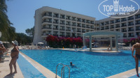 Отдыхали с друзьями в этом отеле в июне месяце. Начну с территории: не очень большая, но уютная. Отдельной красотой стоят пальмы вдоль центрального бассейна, лежать под ними одно удовольствие! С лежаками проблем нет. В центре бассейна есть остров с круговым водопадом, очень красиво! Кроме центрального бассейна есть еще 2 бассейна: первый для тех кто хочет тишины и спокойствия, там играет спокойная музыка и второй с морской водой и небольшими горками, кстати на центральном бассейне тоже есть приличные горки. В целом территория очень чистая и ухоженная. Для совсем туристов-малышей также есть свой бассейн. Отдельной благодарности заслуживают девочки, которые возятся с этими туристами-малышами- мисс Надя и мисс Мира. Дети их обожают!