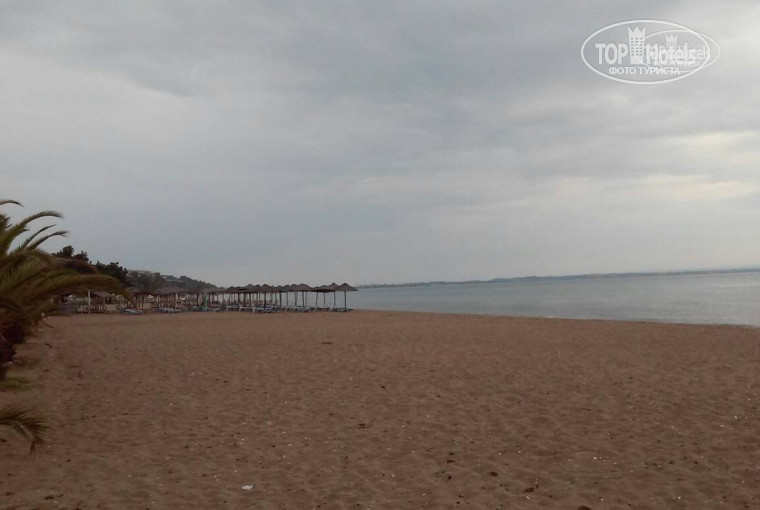 Пляж: 5 мин. от отеля, длинная полоса песчано- галечного пляжа, песок + небольшие камушки. Можно прямо на песке - бесплатно, можно расположиться на одном из шезлонгов прибрежных баров, для этого надо взять напиток в баре (кофе греческий - 2.5 евроили сок 3 евро + бесплатно 0.5л воды). В пользовании шезлонг, зонтик, столик, стул пластиковый хоть целый день, пока не уйдешь. Потом просят заплатить по новой. В общем, думаю, одно удовольствие- на шезлонге с чашечкой греческого кофе с глоточком ледяной воды.