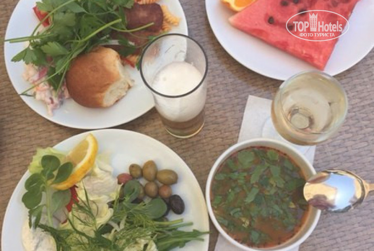 Питание в отеле очень хорошее,для четверки было неожиданно приятно - и вегетарианцы и мясоеды останутся сыты и довольны)) Куча вкусных фруктов (сладкие арбузы,дыни, сливы, яблоки,нектарины), много зелени вкусной, ароматной, овощей, рыбы, каждый день мясо или рыбу жарят на гриле, на утро пекут блинчики, кашка всегда есть по утрам, 2 супа - овощной и мясной и т.п. Днем пекли очень вкусные пончики и гезлеме))