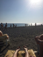 На пляже приятная очень мелкая галька, ходить по ней одно удовольствие) Лежаки всегда находили свободные, в любое время дня) Заход в море пологий. Иногда были волны, когда не очень сильные - плавать классно на них, особенно на матрасе) Но пару раз были очень сильные волны, в море было не зайти
