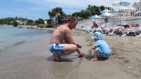 Пляж конечно не далеко, песок, есть камушки при заходе в нескольких местах, но это мелочи. Море было то холодное, то теплое не угадаешь, но чаще прогревалось к вечеру. Пляж у отеля маленький, лежаки стоят в 20 см. друг от друга и то их не хватает. Мы не жаворонки, в 7 утра на пляж не приходили, к 10 утра лежаки находили с трудом. Пляж чистят редко, не помойка, конечно, но хабарики есть, тина в море очень раздражала, ребенок однажды нашел битый бокал(( Пару раз видно убирали пляж тины в море не было и песок был почище, видимо раз в неделю у них там уборка, надо бы чаще, это к руководству отеля, если они читают отзывы))) Лежаков не хватало и у бассейна, даже в 5-м ряду все занято))) Муж как то пришел в 8 утра и урвал последние 2 лежака у детского бассейна. Положил вещи и ушел курить, смотрит приходят двое турок (отдыхающих), убирают чьи-то полотенца, кладут свои и уходят, к бассейну они пришли часам к 12 дня, он специально наблюдал за их лежаками)) И такая практика там не редка)) Количество людей на такой не большой территории это самый большой минус для нас, в остальном все было хорошо.