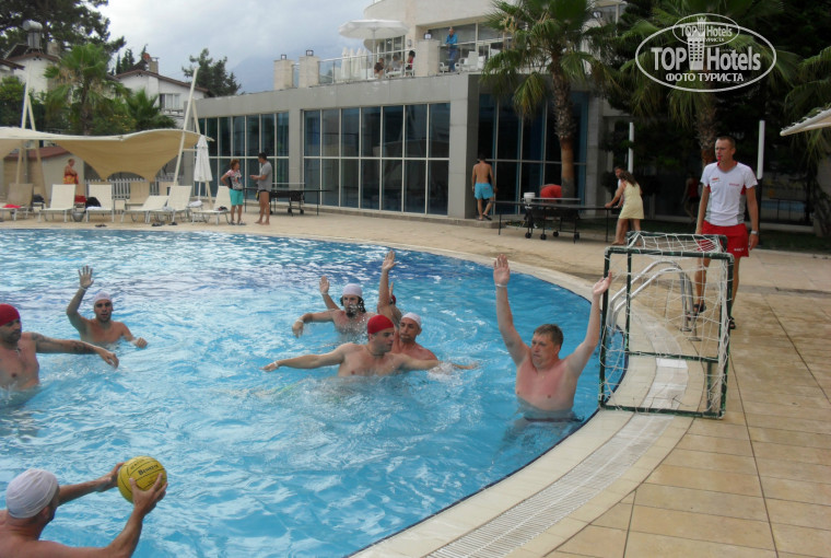 навесные тенты.Море- чистое,бирюзовое,теплое,волнующее-это то, за чем мы едем!!И,немножко дегтя в бочку меда,лежаков свободных не найти уже в 8:00- 8:30 ни у бассейна ,ни у моря,хотя лежаков достаточно много.Многие отдыхающие просто занимают лежаки и у бассейна и на пляже,и часто они пустуют часами и тем кто не любит рано вставать на отдыхе придется как-нибудь приспосабливаться,что мы и делали(располагались на пустых ,но занятых какими-нибудь платками лежаках и,частенько,обладатели их так и не появлялись).Администрации отеля надо что-то с этим делом предпринимать.Это единственное,что нас напрягало на отдыхе.Контингент отдыхающих-в основном русскоязычные из стран СНГ(Россия,Украина,Белоруссия,Казахстан),немного из прибалтийских республик,турки и единицы из Закавказья.