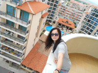 Заселяют в отель строго в 14.00, правда, нам предложили за раннее заселение доплатить по 20 лев с человека, мы отказались и отправились осваивать окрестности, вкусно позавтракали в соседнем кафе, сходили на пляж. Ровно в 14.00 нам одели браслеты и выдали ключи от номера на восьмом этаже. Номер 810 оказался очень просторным, с приятной мебелью в светлых тонах. Главное достоинство номера - огромный балкон с панорамными видами градусов на 260, с высоты восьмого этажа просто дух захватывало. А главным недостатком считаю ванную комнату, она, конечно, большая, но два сливных отверстия прямо в полу не очень справлялись с объёмами воды, поэтому пол был всегда влажным. В ванной комнате установлены два дозатора для жидкого мыла и шампуня, никаких «приятностей» в виде кремов и бальзамов не было.