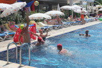 5. Бассейн в отеле большой, лежаки тоже всегда свободные есть. Вода пахнет хлоркой. Но терпимо. Есть горка для самых маленьких, глубина детского бассейна 0,45м. Большого 1,45м.