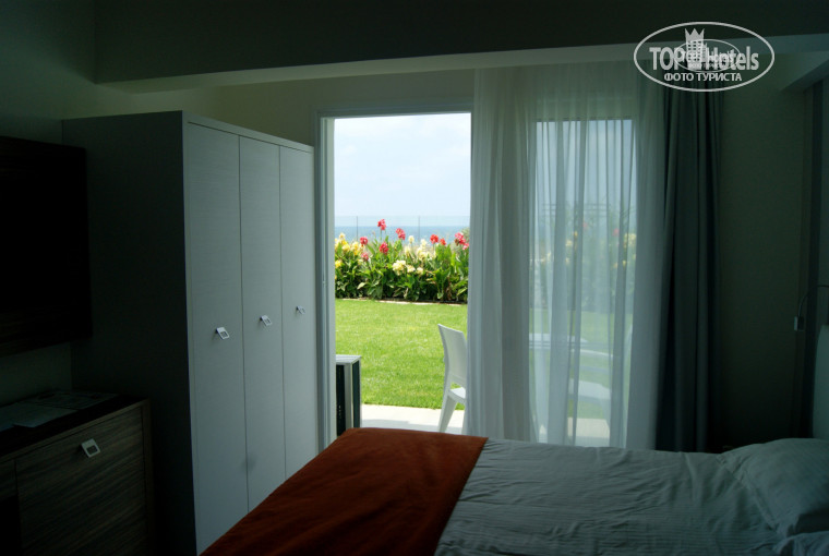 Номер с видом на море,на первом этаже (413).Моря конечно видно только краешек,но за окном прекрасная зелёная лужайка.