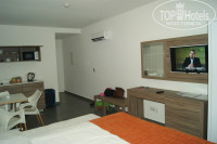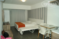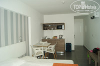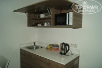 Этот отель-апартаменты и поэтому в номере была маленькая кухня с микроволновкой,холодильником(15 евро -неделя) и полным набором посуды на 3 персоны. Так же сейф(15 евро),телевизор.Всё новое.