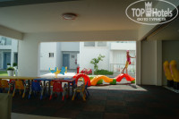 Есть детская площадка с пластмасовым домиком,горкой и качалками.Платный бильярд(1 евро)и игровые автоматы.
