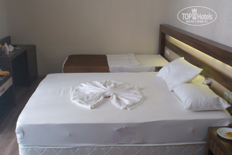 Добрый день! Я долго выбирал в каком из турецких отелей провести свой отпуск в июле 2015. После долгого поиска, остановился на данной гостинице. На картинках, представленных в туристических каталогах, отель выглядит великолепно. Но начну по-порядку. Во-первых, сразу по-приезду в отель в 9.00 персонал сказал что свободных комнат практически нет, так как в отеле отдыхает ОЧЕНЬ много народу и разместить нас могут только после 14.00. При этом из комнат могут дать только первый этаж другого корпуса. Так и получилось, заселили нас в номера с видом на руины, помойку и разрушенное здание. При этом, номер был абсолютно не готов: не было полотенец, душевых принадлежностей, не работали пульты от тв, на балконе отсутствовали стулья. Влажность в номере была очень большая. Вентиляция не работала, вещи были всегда мокрые. На наши многократные просьбы пересилить нас в другие номера персонал на рецепшене отвечал отказом и отсутствием свободных номеров. Вроде как "скажите спасибо, что такие есть". Телевизор в номере не показывал, кондиционер после пары часов работы вибрировал как трактор, в том числе и по среди ночи, спать было не возможно. Кроме того, в номере очень темно работает одна лампа. Это является нарушением норм освещенности. В отелях подобной класификации. Персонал кроме турецкого языка не знает ни какого другого. Даже международного английского. Уборку в номерах проводили регулярно.