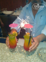 В баре бесплатно пиво (легкое, 2,5 градуса где-то), вино (красное/белое сухое), раки, узо, кола, спрайт, фанта, соки. За отдельную плату можно купить коктейли) Нас Манолис угостил перед отъездом бесплатно фирменный коктейлем "Секс на пляже", в фотообзоре посмотрите)). Весь бесплатный алкоголь наливают без ограничений) Платный - на сколько денег хватит) Есть также фирменый бренды "Jameson", "Jack Daniels", "Grenadin", "Bacarddi" и т.д. Но, естественно это не бесплатно)