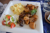 В кафе рекомендуем попробовать национальные блюда: клефтико (баранина, которую томят в печи в течение 5 часов), тавас (тоже баранина), мусака (чем-то напоминает наше овощное рагу с фаршем). Мы не пробовали мезе, так как ездили вдвоем, а мезе (рыбное или мясное) предполагает, что вы оплачиваете сразу две порции, даже если один приходите, и вам начинают выносить блюдо за блюдом и их такое количество, что там и двоим-то много будет. Порции на Кипре большие, но они состоят из небольших объемов разных продуктов, например, рис, картофель-фри, свинина, салат. Самые ближайшие к отелю кафешки Le Cygne - прямо на общественном пляже и чуть дальше по дороге Ellinadico Tavern. В любом кафе у них есть комплексный обед, который включает несколько блюд, например, чесночный хлеб, клефтико и мороженное (от 12 до 18 евро).