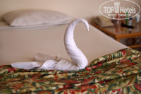 Номер который нам предоставили сначала мне не понравился, показался неуютным и убогим. Похоже, что это был когда то двухкомнатный номер, разъединенный на раздельные комнаты. Я сходила на ресепшн и спросила о возможности его заменить. Меня заверили, что завтра, если я еще захочу, то мне его поменяют. Но утром мы оценили все достоинства номера и менять его расхотелось. Номер большой с двумя огромными окнами с видом из обоих на море. Еще плюсом было то, что в номере все работало без карточки, так что приходя с пляжа мы заходили в прохладный номер. Еще хотелось бы восхититься качеством простыней, очень гладкие и приятные на ощупь, белоснежные. Полотенца меняли часто, нареканий нет. Чаевые оставляли - крутили фигуры. Холодильник ежедневно пополнялся, а если не забывали оставить чаевые, то в эти дни напитков было побольше.