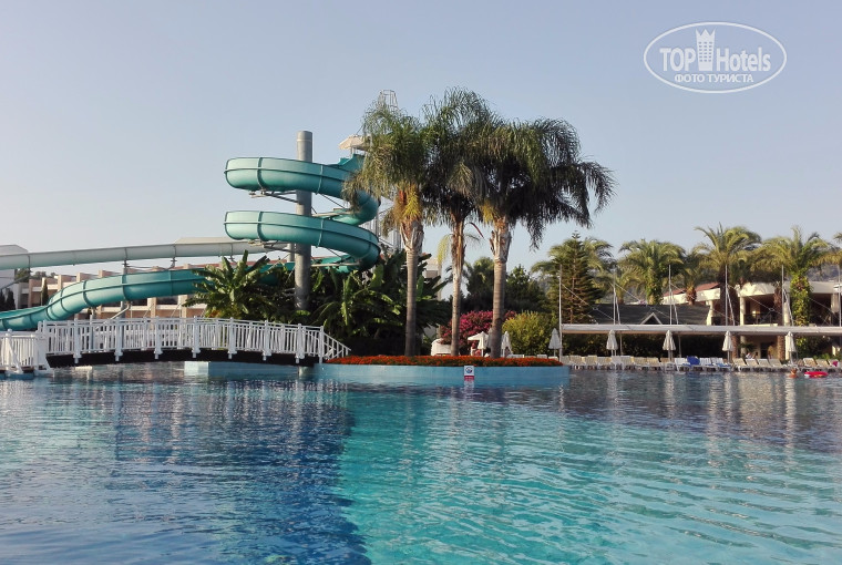 7. Море лежаков у бассейна и отличные навесы + горки для взрослых и несколько детских. На море лежаков тоже всегда хватает. В бассейне всегда 29 градусов