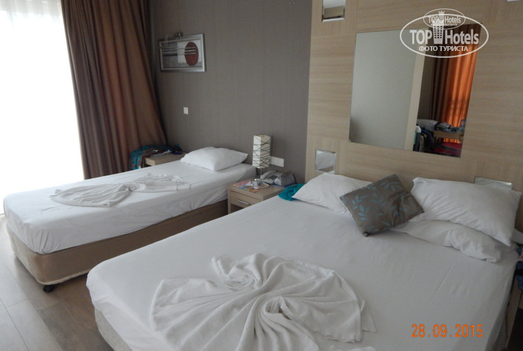 НОМЕР у нас был забронирован "Джуниор сьют", но на первые сутки нас поселили в фэмели, потом хотели переселить в номер для инвалидов, просторный, но под крышей и в ванной комнате вместо столешницы стоит табуреточка возле раковины, в общем, мы отказались и нас поселили в наш Джуниор - отличный номер с двумя панорамными окнами, светлый и солнечный. Одно было оооочень плохо - это БЕЗУМНО ГРОМКАЯ МУЗЫКА на территории нашего отеля и соседнего тоже. Не спасили даже полностью закрытые окна - ребенок плохо засыпал, сами мы ждали до 23.30, когда все выключали. Анимация, конечно, это хорошо, но мера должна быть - не все приехали веселиться, в отеле много маленьких детей и пожилых людей.