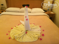 Отдыхали парой в конце октября. Привезли в отель , разместили достаточно быстро, территория отеля огромная но не очень то и ухоженная. Номер достался с видом на теннисный корт, зайдя в номер можно сразу ужаснуться состоянием мебели. Номер довольно просторный , помимо кровати, шкафа и прикроватных тумб , был журнальный столик с двумя стульями , 2 зеркала. В номере был сломан телевизор , точнее сама его опора на которой он криво стоял , обратившись на ресепшн с этой проблемой в течение получаса 2 "мастера" пытались устранить эту проблему, но ничего у них не вышло и они решили просто присобачить телевизор к тумбе намертво. Ну хоть попытались и на этом спасибо, номер менять не стали, но по хорошему нужно было потребовать либо замену телевизора ,либо номера, мы заморачиваться этим не стали так как не хотелось никаких разбирательств с персоналом. На балконе номера ночью кишат муравьи, если не закрыть балкон, будьте любезны разделить своё спальное место с этими маленькими соседями, в ванну они тоже проникали ,так как окно и вентиляция в ванне выходит на балкон . Сказать что питание в отеле ОТВРАТИТЕЛЬНОЕ это ничего не сказать! Просто ужас, отравление не заставило себя ждать уже на второй день отдыха. Все пресное и однообразное, каждый день одно и тоже . В отеле 3 ресторана , в один так и не сходили говорят там нормальное питание ,его можно посетить бесплатно всего 1 раз за все время нахождения в отеле и по предварительной записи. Ресторан Альденте это просто тихий ужас, там лучше вообще не питаться , вкусного нет совершенно ничего, честно не знаю что там могут есть люди. В ресторане Лотос ситуация получше ,там хоть можно выбрать ещё что то , чтоб хотя бы просто загрузить в свой желудок , дабы не испытывать чувство голода. Сами аниматоры говорят что кушать здесь нечего!