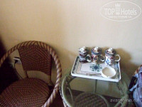Мы жили в трёхместном номере 202 на втором этаже, в нём тоже поначалу было влажно, пришлось открывать окно и дверь, чтобы хорошо проветрить. В номере было пыльно, окна давно не мыты, шторы очень грязные. Есть типа одноразовые тапочки) - резиновые сланцы, но, конечно, лучше иметь свои. Единственное - белоснежное постельное бельё хорошего качества. Понравился чайный уголок с плетёными стульями и столиком, правда, пить из местных чашек желания не было.