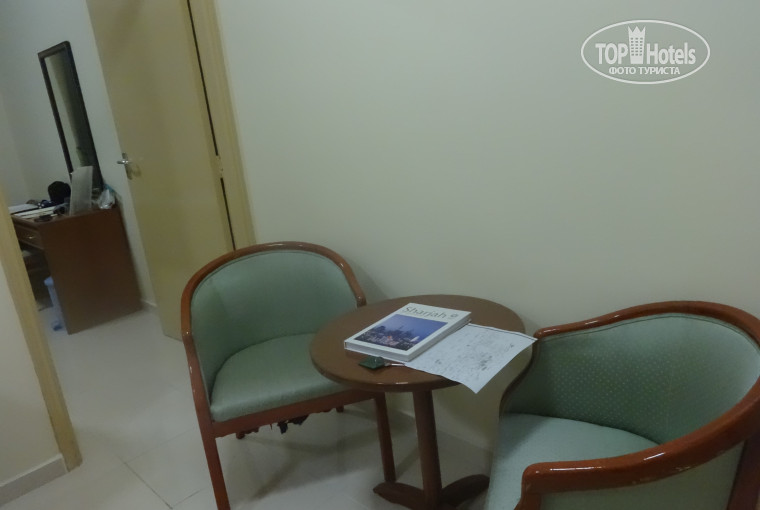 Отдыхали в отеле в начале февраля 2016 года. В принципе все соответствует предыдущим отзывам. И так, по порядку. Номер дали на 6 этаже. Номером назвать трудно - это полноценная двухкомнатная квартира с кухней и балконом. В номере можно курить. Есть сейф и электрочайник. Кровать двуспальная, хотя на ней могут уместиться четверо. Телевизор с плоским экраном и 3 русских канала (планета РТР и 2 музыкальных). Из минусов - в ванной комнате после принятия душа на полу были лужи. Мебель в номере старая, видимо ровесница отеля, но для нас это было не важно, так как в номер приходили переодеться и переночевать. Номер убирали ежедневно, меняли постельное белье и полотенца. На рецепцшен работают филиппинцы - у них довольно сносный английский и они понимают простые просьбы по-русски ( у индусов и пакистанцев английский ужасный, можно разобрать только конец фразы). Адаптер под наши розетки дали без проблем, на просьбу освободить минибар ( он же холодильник) ответили положительно, но за неделю так и не освободили - при выезде никаких проблем не возникло. Wi-fi платный - 10 дирхам в час (около 220 рублей), сигнал хороший. Карту тоже на рецепшен можно взять и по ней ориентироваться в Шардже.