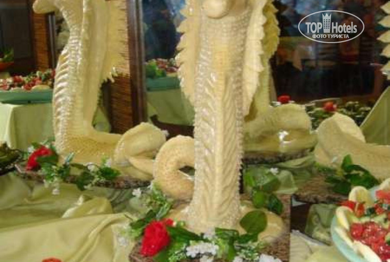 Кормили вкусно - несколько видов гарниров (рис, пюре, овощное рагу, запеченная картошка, кукуруза), курица, телятина, баранина, кролик, рыба – жареная, отварная. На улице каждый день готовили на гриле разнообразное мясо и рыбу, делали шашлыки. Разнообразные салаты, море холодных закусок, очень понравились блюда из баклажанов. Была еда и для тех, кому нельзя острое и жареное (отварная курица, овощи на пару). Порадовало украшение блюд, красивые фигуры из тыквы, букеты из баклажанов и кабачков. Сладостей было тоже много и все очень вкусное, устоять невозможно, из фруктов – яблоки, апельсины, грейпфруты. Под конец стали делать фруктовые салаты с клубникой, но к ним всегда была очередь, и расхватывали их за 1 минуту.
