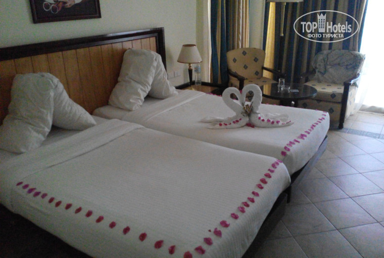 Приехали быстро на трансфере в отель 7.30 часов. По приезду нас отправили на завтрак. Вышли из столовки сразу пошли за ключами от номера. Номер дали отличный с видом на море и шикарный вид с бассейном (10$). И в 9.00 мы были уже на теплом море. Рыбок много красивых. В 10.00 нас нашли аниматоры и звали на водную аэробику. В 13.00 уже бежали на обед. Персонал очень вежлив и приветлив, главное к ним относится так само приветливо. Территория красивая. Номер убирали нормально. За 1 доллар лепили бабочек и лебедей. Каждый вечер после ужина были какие-то конкурсы, танцы, караоке, дискотеки, выступление и т.д. Скучно не было. Пролетают дни очень быстро. Старались просипаться вовремя в 7.00 и ложились спать в 01.00. Можете сходить к соседнему отелю Барону, погулять по территории. Единственный минус - аниматоры предлагают поехать в клуб за 15-20 долларов (мы видели какая наркомания тусит в клубах, ужас). Квадрики - 20 долларов, круто не пожалеете. Еще внизу ресепшена есть киоски, не забудьте зайти к спасителю от ожогов Ахмеду. У него доступные цены на масла, духов, чай вкуснейший, он может вам любую экскурсию найти по доступной цене. Рядом в отделении киоска мы купили обувь для плавания за 5 долларов. Советую еще сьездить в Сохо - 4 доллара за машину.