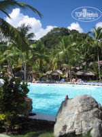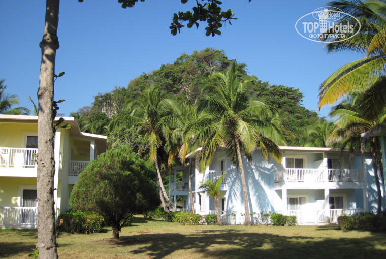 Отель. В принципе это один отель, так как пользоваться можно инфраструктурой обоих отелей, кроме ужина. Просто отель раскинулся вдоль пляжной линии на расстояние чуть больше километра, и для удобства хозяева разбили его как бы на два отеля. А так как Merengue делится еще огромной скалой на две части, Village и Garden, то они для удобства гостей сделали еще три рецепшн. Один в Бачате и два в Меренге. Раньше мы отдыхали в Пунта Кане в Grand Bahia Principe Bavaro, и, несмотря на то что Байя намного дороже и имеет бОльший рейтинг, в Риу мне понравилось гораздо больше. Отель по расположению бунгало, зелени напоминает хорошие клубные отели Турции. Многие пишут в отзывах, что Меренге Вилладж это тройка и в нее селят только русских. Дурь полная. Не верьте. Живут и иностранцы и русские. Есть и немцы, американцы, много канадцев, звучала и польская речь. И по цене и Бочата и Меренге сопоставимы. Бочата подороже тысяч на десять, скорее всего из-за меньшей плотности заселения. Итак Бочата находится восточнее (около беседки на мысу), в середке «сад» и западнее «деревня». И правда деревня, между бунгало петух с курицей и цыплята бродят. В Бачате корпуса трёхэтажные, в Меренге двух. Причем в «саду» расстояние между корпусами такое маленькое (между некоторыми), что можно по-моему с балкона на балкон перешагнуть. У нас в «деревне» расстояние между корпусами нормальное. В «деревне» есть еще трёхэтажный корпус на 66 номеров, самый дальний от океана, но он в наш заезд пустовал. Да в прочем вообще наша деревня была полупустой. В главном ресторане половина зала стульями была загорожена. Да и оставшаяся половина полупустой всегда была. И у бассейна и на пляже мест свободных полно в любое время. Место очень живописное. Пунта Кана в районе Баваро никакого сравнения не выдерживает. Если встать лицом к океану, то справа за забором очень живописная скала, заросшая лесом. Также скала есть на территории отеля между «садом» и «деревней». Правда тоже огороженная забором. Вокруг отеля тоже горы. Правда невысокие. Хотя с удивлением узнал, что пик Дуарте в Доминикане почти что 3 100 метров.