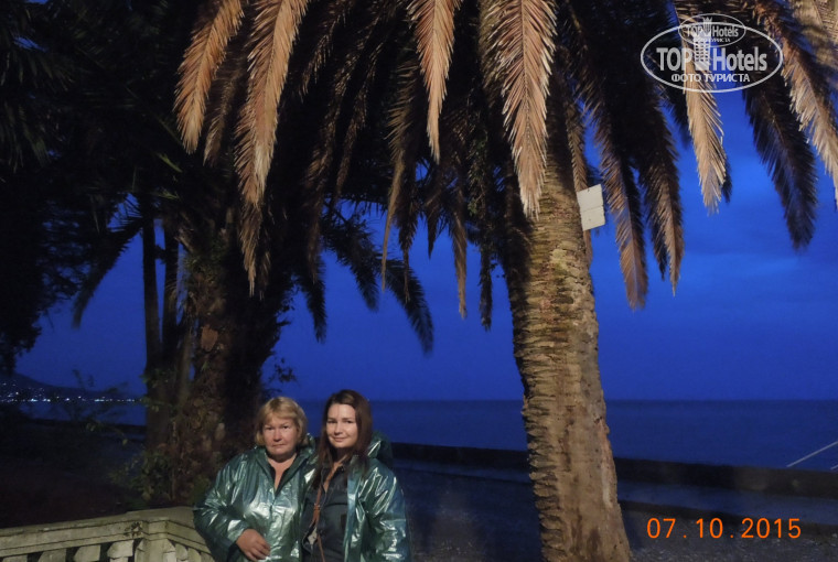 Природа там шикарная, запах пальм, зелени, моря. Сам отель находится в очень красивом месте, его окружает заброшенный парк с красивыми каменными вазонами, тропинки,смотровые площадки, пальмы большие и маленькие. Это всё абсолютно заброшено и неухожено. В этом конечно, есть своя романтика, Интересно как природа берёт своё,но не до такой степени! Это монументально когда-то было, там отдыхала вся элита и т.д. Но сейчас..... обидно. всё запущено. А ещё там очень много собак! бывает страшно когда они начинают лаять на тебя без причины. Но для Абхазии это видимо норма
