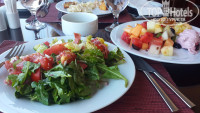 на завтрак выбор большой, яйца 3 вида, каша, хлопья, сосиски, колбаса, сыр, картошка или хашбраун, местная кухня, овощи, фрукты, йогурты , выпечка, напитки. Ужин концепция отеля гриль, можно прийти на ужин с улицы и поужинать за 70 дирхам (если не ошибаюсь) . на выбор говядина, курица, рыба, баранина на гриле, рис, картошка, макароны, салаты, один вид супа. Из напитков только вода. Выносить еду из ресторана нельзя, за этим следят, при входе в ресторан нужно сдать сумки в камеру хранения.