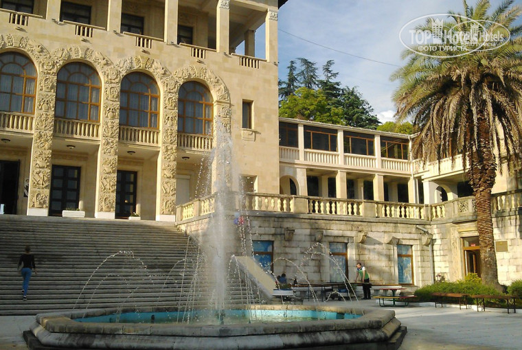 Итак, первое впечатление: заброшенность территории и мысль развернуться и искать варианты спонтанно в частном секторе. Впечатление это было обманчиво. Объясню почему: остановка "Пансионат Орджоникидзе" на самом деле находится в нескольких сот метрах от парадных ворот. Поэтому выходить нужно на остановке "Санаторий Приморье". От неё до главного корпуса идти 100 метров. А от остановки "Пансионат Орджоникидзе" нужно плутать по полузаброшенной территории, при этом поднимаясь по горному серпантину.