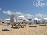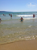 ПЛЯЖ. Пляж совсем под боком. Три минуты ходьбы вдоль отеля Европа( высокое желтое здание). Там есть указатели и деревянные дорожки, которые ведут к морю. Там, где стоят шезлонги, там платная территория. Лежаки и шезлонги по 10 лев. Дорого. Они практически пустовали. Все предпочитали лежать на песке. В июне море ещё холодное и волны. Но многие купаются. Вход в море ровный и чистый.