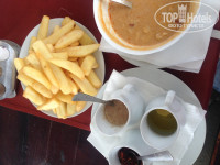 РЕСТОРАНЫ. Обедали каждый день в разных местах, поэтому есть с чем сравнить. На обед обычно заказывали супы, иногда ещё и второе. И так, место, которое хотелось бы посоветовать, это ресторан FAR...a. Находится рядом с отелем. Пожилой хозяин (зовут не то Петр, не то Петрос) ресторана всегда стоит по дороге на пляж и приглашает людей, не настойчивый, просто приглашает и даёт визитку. Готовят там вкусно. Цены средние, а кое-что так даже и дешевле, чем в других местах по городу. Например, суп куриный Пелешка - 2.5 лева. Стоит попробовать, очень вкусно и сытно, этакий куриный суп с макаронами. Суп Шкембе чомбе (название вроде такое) - 3,20 лев, тоже вкусный, но специфический, очень сытный, но по мне так жирноват, чисто для мужчин)). так же заказывали там лепёшку, она у них вместо хлеба, на двоих - 2 лева. приносят различные соусы и приправы (входят в стоимость). Брали картошку фри - 3 лева - огромная порция, так что можно брать одну на двоих. Пиво 0,5 бокал- 1 лев. Вечером там живая музыка.