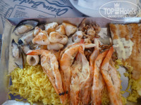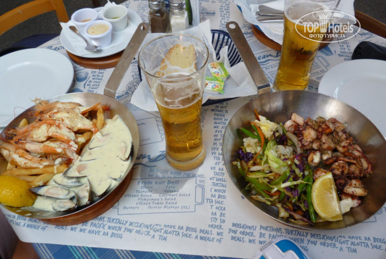 По поводу обедов в кафешках цены тоже очень разные. Мы прилетели в обеденной время, переоделись и пошли искать где покушать. Случайно зашли в одно место, заплатили за обед на двоих 37€, и были вроде как довольны, так как везде пишут что поесть 50€ на двоих. Но потом, походив и посмотрев, обедали уже за 25€-30€. Мы, правда, брали только основное блюдо и пиво или воду, потому как про размер тамошних порций уже все слышали? ) Почти возле каждого заведения есть стойка с меню и ценами, подходите, смотрите, выбирайте. И конечно посетили ресторан Ocean basket. Очень понравилось!!! Большая сковородка с картошкой фри или рисом, мидиями в соусе и креветками стоит 10€. Порция осьминога-гриль с картошкой, рисом или овощами-8€. А самой вкусное, что я там ела, поднос с морским ассорти (рыбка, креветки, мидии, маленькие кальмары, осьминоги) и гарнир. И все это удовольствие всего 14€. В обеденное время народа там хватает.