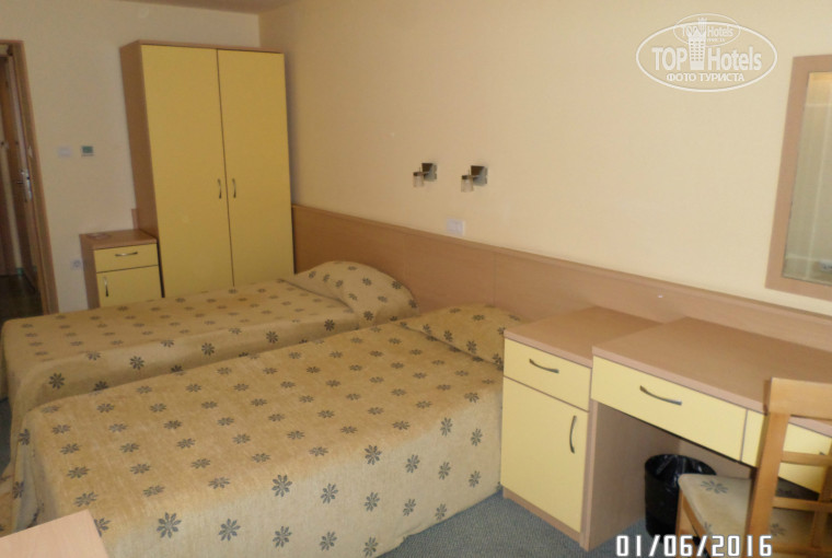 В начале июня отдыхали в отеле Калофер. Номер достался на 2 этаже с выходом во двор. Теневая сторона. Всегда тень. Мебель в номере не новая, но добротная. Электроприборы работали исправно. На мой взгляд многовато тумбочек. Можно было освободить часть пространства путем объединения тумбочки под телевизор и холодильник со столом. Впрочем, там не танцевать... Практически никто из персонала не говорит по-русски. Только один молодой человек на ресепции немного понимает и официант в баре. С остальными - английский. Wi-fi ловит хорошо. Возможно, было связано с тем, что в отеле было не много народа. Питание по путевке - завтраки. Обычный континентальный завтрак с тостами, омлетом, колбасой, сыром, йогуртом и хлопьями. Из фруктов на завтрак (в начале лета!) были дыни, арбузы и апельсины. Сладкие, надо сказать.
