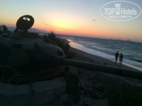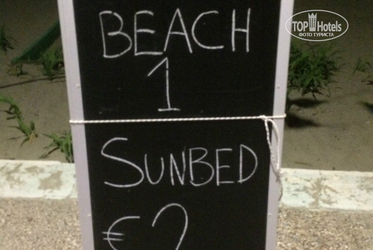 1) Отель находится в первой береговой линии, можно сказать у него свой пляж, НО лежаки платные - стоят 3 Евро один лежак. А если хотите под зонтиком, то придется раскошелится сразу на 6 Евро за пару деревянных лежаков.