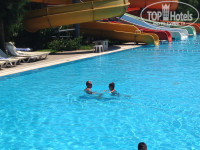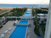 6. Бассейн очень большой, выглядит как один длинный от отеля и аж до моря, но разделен на 5 частей. Вода пресная и теплая. Кстати есть волновой бассейн. Шезлонгов куча, всем хватало. Кстати аквапарк на территории, вся детвора там и жила, было сложно сына оттуда вытянуть..
