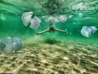 Еще не далеко от отеля есть каменистый пляж "Рыбзик". С не высокими скалами, с которых можно нырять. Там есть дайвинг.