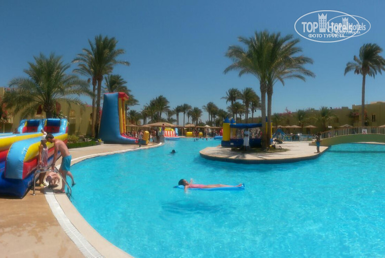 Постараюсь быть объективной. мы попали в период переполненного отеля, процентов 70 местного населения. рамадан! остальные - Украина, Белоруссия, Немцы, Австрийцы... Заехали в отель в 7 утра, а поселили ближе к 16. В отеле не вешают браслеты и поэтому сразу в доступ все рестораны и напитки, в обед ребенку пришлось спать прям на рисепшине, на диванчике. Но мы были начитаны и в ручную кладь взяли купальники и одежду на случай позднего заселения. за это время заняли лежаки, осмотрелись, расспросили, изучили территорию. В приоритете местные, они больше платят и сколько мы не бегали, не ругались... но поселили нас поздно, хоть и дали 10 дол за хороший номер! Номер дали хороший, и море видно и бассейн. Персонала мало и явно ребята не успевали за всеми. утром после ночных гулянок было достаточно грязно(на пляже тарелки, чашки, стаканы, окурки... на траве, кустах , под кустами - стаканы... могло так и до обеда пролежать и дольше!!!) Персонал не надоедливый, приятный. Видно, что просто не успевали за всеми.. персонал разнорабочий - то таскают лежаки, потом убирают номера, потом моют у бассейна, вечером разносят напитки... но и лишнего тоже не сделают... Если ехать сюда с инспекцией - то проезжайте мимо, туалеты общественные попахивают, текут и часто можно застать переполненные урны в туалетах( на рисепшн, возле моря, возле бассейна с горками), хоть и убирают достаточно часто. немного не хватало душей, чтобы после пляжа смыть ноги, были только по краям пляжной линии, Кондиционеры работают, вода есть, комары не досаждают, еды всегда хватало, даже с излишком, на поздний ужин даже не ходили (с 23 до 24)!! Из фруктов - апельсин, грейпфрут, финики, виноград, апельсин,яблоко - хоть и сезон манго и арбузов! но мы переходили через дорогу и покупали манго, папайю и арбуз. Продавцам можно заказывать - привезут на след день. Аниматоры хорошие, поиграют, порисуют, бесплатный аквагрим, вечером мини-диско, горки под присмотром персонала. Уборка номеров каждый день, но мы иногда вешали табличку не убирать и нас не беспокоили. В целом все отлично, ребенка всегда было чем покормить, а особенно был положен глаз на картошку фри у бассейна в обед, и спагетти и пицца в пн-ср-сб там же, но нужно записываться(типа а-ля карт), бассейны на любую глубину, радовали его горки в бассейне, в воскресенье вытаскивали надувные атракционы для детей и взрослых, море чистое, только иногда заплывало парочка медуз, пляж хороший и зайти приятно, и замок построить!!