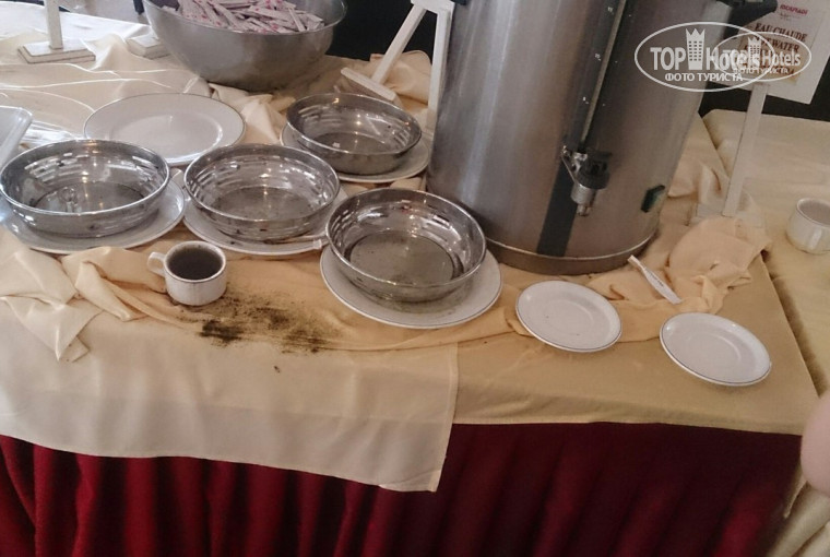 Для детей нет еды. Пол часа на завтраке пытались добыть хлопья, тарелку с отколотым куском и пластиковую чайную ложку, когда потребовали молоко принесли через 15 минут графин с молоком и плавающим в нем мусором! За ту ущербную еду которую выбрасывают работники как свиньям в корыто приходится стоять невероятную очередь и иногда подраться. Да, драки это норма 1-2 в день стабильно, у ресепшн каждый день чуть ли не митинг, мат, ор на весь отель. В столовой воняет помойкой и выглядит соответственно. Столы многие туристы убираю сами, тк ждать можно вечность и новую скатерть не постелят, а перевернут старую грязную. Тарелки и приборы грязные. Выбор еды для 4х звезд крайне скудный.