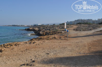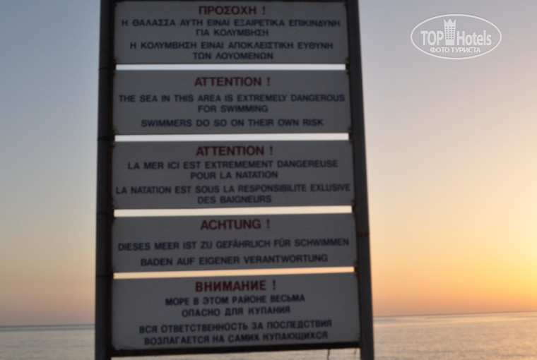 Купили путевку в ТЕЗ ТУРЕ, просили пляжный отдых, т.к. бассейн нас не впечатляет, хотелось море и хороший заход в него, страна не имела значение. К великому сожалению в море купаться категорически запрещено, о чем предупреждает плакат, т.к. существуют подводные течения и неоднократно были случаи со смертельным исходом. Вывеска эта висит постоянно, а не только, когда штормит. Соответственно пляж не оборудован никак. Народ конечно купается, но вся ответственность лежит на самих купающихся. Это самый большой минус в нашем отдыхе. Экскурсии тоже лучше не брать. Взяли экскурсию "На земле и на море". Полное разочарование. Водитель разговаривал только на английском и греческом языках. В нашей машине была девушка с Прибалтики, которая могла с ним разговаривать по-английски, а нам приходилось только крутить головой (но это может и минус нам - надо учить английский). Если она переводила что-то своей бабушке на свой родной язык, то она иногда нам. А экскурсовод нас встретила только у затонувшего корабля. Повезло тем, с кем экскурсовод была в машине.Потом нас повезли на пароход.На пароходе как таковой экскурсии тоже не было (повернитесь направо, повернитесь налево). Далее опять на джипах, после остановки нам должны были рассказать, почему вся деревушка построена в одном стиле и с одинаково окрашенными крышами, но мы эскурсовода не дождались. Экскурсия дорогая (80 евро с человека), но бестолковая. Сервис и обслуживание в отеле тоже не блещут для 5*. Приходишь с пляжа часам к 12, а полотенец нет ни грязных, ни чистых. Принесут часам к трем. Но это не каждый раз. И уж если совсем быть придирчивой, то шторы все засаленные, как-будто руки об них вытирали, совсем не пригодны для 5*. И еще один большой минус - это платный холодильник и нет питьевой воды в номере. Да ее можно взять в баре, а если захочется попить после закрытия бара, да и вообще, за каждым глотком бежать. Поэтому воду мы купили в ближайшем магазине (это нам предложил наш гид), а у нас все включено.