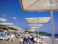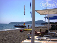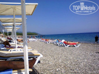 через дорогу, минут 5 тихим шагом. Через дорогу идите трезвыми и пропускайте транспорт, там пешеходам никто не уступит, только бибикнут возмущённо. Нас не напрягало. Море обалденное, чистое и тёплое. Почти всегда было тихим, волны были раза 2-3 за 9 дней, с учетом того, что на пляж идёшь утром и вечером, а значит - 18 раз! Галька с крупным песком(из перемолотой веками гальки, колючий). Но можно обойтись без спецобуви вполне. Лежаки и зонты бесплатно, много, хватает на всех, ещё и выберешь, где больше нравится. Береговая линия метров 100, поплавать места много. Толпы нет, вольготно. Класс! Ощущение, что пляж городской, тк часто приезжают местные семьями, иногда что-то празднуют в кафе на пляже. Всё нормально, кроме того, что пускают на пляж с собаками - КУЧКИ никто не убирает! Иди и СМОТРИ под ноги! Поначалу не могла понять, что дамочки об травку ноги на газонах вытирают. Отвратительно! Там же детки играют! Отдельный МИНУС - душ на пляже. Он в жутком состоянии. Мало того, что не работает 1 из 3 душевых леек на весь большой пляж, но и 2 оставшихся выдают напор вверх больше, чем вниз - помыться сложно. Более-менее работала 1 лейка, поэтому ждёшь в очередь. Иногда душ отключали, приходилось ждать почему-то. На рецепшн проблему выслушали несколько раз, но НИЧЕГО не сделали. Гид САИД от Пегаса тоже обещал помочь, но он только болтает хорошо, пел долго соловьём на встрече про экскурсии, невзирая на просьбу сначала по делу, а потом про экскурсии с теми, кому это интересно. Не ведитесь на предложения, многие вещи надо оценивать, сравнивая.