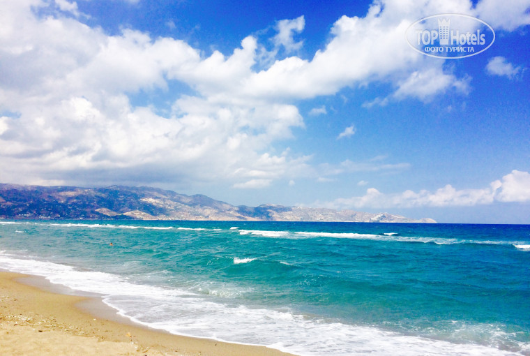 Что касается самого отеля, здание не новое, номера простые: две кровати, столики, стулья, зеркало, тумба под чемодан, шкаф, кондиционер. Туалетная комната: собственно туалет, душ с поддоном (в нашем номере вода не очень хорошо сливалась, но мы клали на пол полотенце), раковина и зеркало. Номер без телевизора, но было радио), которое мы включали и слушали вместо телевизора)) было очень прикольно! балкон с двумя стульями. Уборка номера раз в 2-3 дня, но пол мыли каждый день. Беспокойстваперсонал не доставлял, т.к в отеле днем мы практически не бывали. На первом этаже напротив входа ресепшн, а также столовая и бар. Весь первый этаж (на 2-3 этажах мы не были) оформлен в стиле Греческого дома ( нам так показалось)). Очень уютно и приятно)) много маленьких вещей, утвари, кукол, ваз... У нас в путевку был включен только завтрак, он был всегда одинаковый: чай, кофе, сок, молоко, сыр, ветчина, йогурт, хлеб, масло и фруктовые джемы. Опять же мы знали про это, поэтому особо не напрягались. Территория отеля небольшая, есть бассейн с лежаками, но мы практически около него не лежали, т.к любим море и ходили исключительно к нему! Пляж песчаный, лежаков на пляже нет, но прям рядом с пляжем, на территории отеля стоят лежаки, их можно взять, но потом обязательно отнести на место. В связи с тем, что в отеле немного номеров, на пляже всегда мало народу, для нас это было преимуществом! В один из дней, мы решили прогуляться по пляжу влево (если смотреть на море), там полно отелей о-ля all-inclusive , народу -толпы, в море -грязь (канализационные трубы идут мимо шезлонгов прям в море!), люди купаются рядом с этой трубой! Фу-фу!