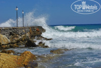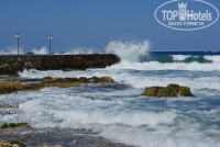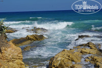 От пляжа ожидали большего. На территории пляжа у отеля совсем невозможно купаться - крупные камни и валуны, но немного в стороне нашли спокойные бухточки, где спокойно можно войти в воду, поплавать. А если пройти вправо метров 400-500, то найдете песчаный пляж с песчаным дном и редкими камнями на дне (территория другого отеля). Но несмотря на эти недостатки берег очень красивый. Правда, с погодой не очень повезло. Вторую неделю дул сильный ветер и море штормило, но находились смельчаки, которые плавали в море. Спасателей не видно было на берегу.
