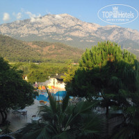 Приезд в отель. Приехали в 23 часа, естественно, нас сразу же заселили, мы при этом ничего не просили (вид, этаж и т.п.). Номер дали на третьем этаже с балконом, вид был на горы, солнце на балкон не попадало (ну или почти не попадало), поэтому в номере жарко не было. У нас работало всё: замок на двери, кондиционер, телевизор, пульт, кран, душ, смыв. Единственное, дверь в ванную не закрывалась плотно, но нас это не напрягало, поэтому мы даже не сразу заметили. А, ещё лампочка в коридоре не горела, но это тоже никак не мешало нам. Ну и душ, это, конечно, беда, у нас ни то, что дверей, даже кабины как таковой не было - просто пол ниже уровнем, где был слив. Горячая вода бывает только после обеда. Утром принимали холодный душ.