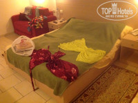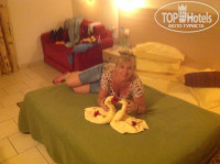 1. Жили мы в главном корпусе, номер 2066. Все работало. Вид красивый, пальмы и кусочек . Зато все под рукой, анимация тоже. С детками в этот номер не советую. Но нам - в самый раз! Мы только за полночь - в номер переночевать, а в дневное время - переодеться! Маленькая лужица на полу под кондиционером, или тараканчик в номере - мы на это вообще внимания не обращали. Зато обращали, что номер всегда убран, чистая, заправленная постель, всегда менялись полотенца, туалетная бумага. Никогда не оставляли чаевых, но приходя в номер - мне аж не удобно было, не сидим мы в нем, а на кровати всегда что-то наверчано, или с полотенец, или из простыни, или с моих платьев-халатиков. Жаль рушить такую красоту, когда приходишь в номер не на долго! Носилась уборщицу, аж искала, чтобы выразить ей свою благодарность!